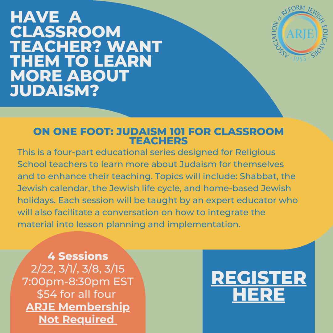 This is a four-part educational series designed for Religious School teachers to learn more about Judaism for themselves and to enhance their teaching. Topics will include: Shabbat, the Jewish calendar, the Jewish life cycle, and home-based Jewish holidays. Each session will be taught by an expert educator who will also facilitate a conversation on how to integrate the material into lesson planning and implementation. Participants are encouraged to attend all four sessions.